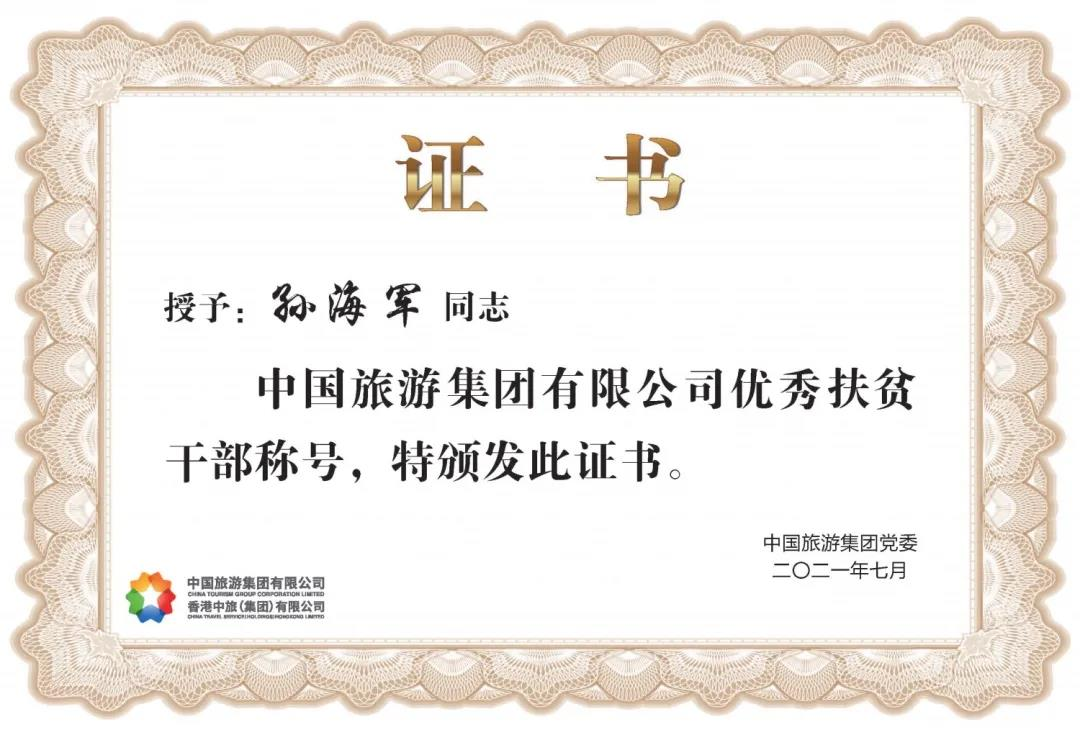 中國旅游集團(tuán)中免股份有限公司黨群工作部被評為“中國旅游集團(tuán)2020年度優(yōu)秀扶貧單位”;黨群工作部組織建設(shè)經(jīng)理孫海軍被評為2020年度優(yōu)秀扶貧干部。