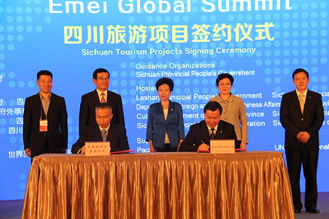 在簽約儀式上,港中投總經(jīng)理許慕韓與樂山市張彤市長簽訂了「關(guān)於合作開發(fā)樂山市、峨眉山市旅遊資源的戰(zhàn)略合作協(xié)定」。姜巖總經(jīng)理與四川省黃彥蓉副省長、省旅遊局郝康理局長和樂山市委唐堅(jiān)書記作為證簽人見證了雙方協(xié)議的簽署。