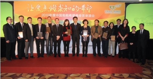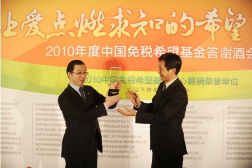 中國青少年發(fā)展基會秘書長涂猛先生致辭。中國免稅品(集團)有限責任公司副總裁陳國強先生代表中國免稅希望基金致了答謝詞。中免集團全體領導上臺,向 “2010年度中國免稅希望基金愛心募捐榮譽單位”頒發(fā)獎牌。隨后,為了表彰中免集團發(fā)起并成立僅僅三年的“中國免稅希望基金”為中國公益事業(yè)做出的突出 貢獻,中國青少年發(fā)展基金會把特別設立的“希望工程20年杰出公益伙伴”獎頒發(fā)給中免集團。