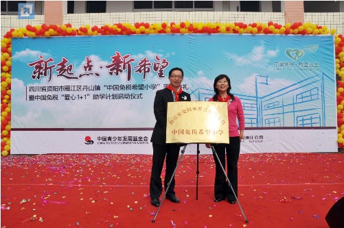 2010年10月11日上午,位于四川省資陽(yáng)市雁江區(qū)丹山鎮(zhèn)牌坊村的中國(guó)免稅希望小學(xué)里喜氣洋洋、熱鬧非凡。特意從北京趕來(lái)的中國(guó)青少年發(fā)展基金會(huì)的汪 敏副秘書長(zhǎng)、馮敏慧部長(zhǎng),中免集團(tuán)盧路總裁和四川省市兩地的領(lǐng)導(dǎo)與全校近兩百名師生一起為新落成的“資陽(yáng)市雁江區(qū)丹山鎮(zhèn)中國(guó)免稅希望小學(xué)”舉行了隆重的落 成典禮。