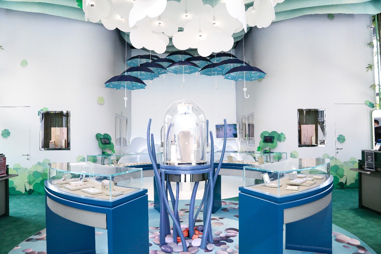 Van Cleef & Arpels梵克雅寶“Alhambra幸運花園”免稅限時精品店位于三亞國際免稅城后廣場。世家要員雅克·雅寶Jacques Arpels常言道:“心懷幸運之愿,方能成為幸運之士。”幸運是梵克雅寶一直以來十分珍視的價值,更是其創(chuàng)意靈感的泉源之一,因此限時精品店內(nèi)部設計以世家標志性四葉幸運圖案為主題,以延續(xù)這珍貴價值。進店后,首先映入訪客眼簾的將是Burcu & Geoffrey 這對法國和土耳其的導演拍檔為Alhambra 特別創(chuàng)作的四葉圖騰造型蝴蝶沿途散播幸運的種子,帶領游客穿梭在幸運花園中,引領大眾一同探索夢幻迷人的Alhambra 幸運花園, 為游客營造出一種舒適愉快的珠寶欣賞空間。