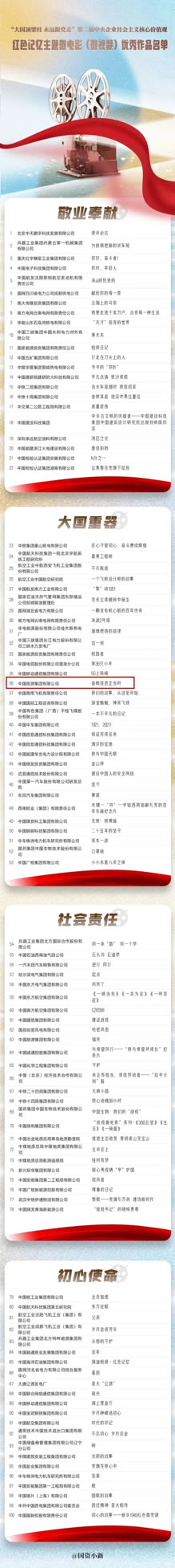 日前,“大國頂梁柱 永遠跟黨走”中央企業(yè)慶祝建黨百年百部微電影(微視頻)展映發(fā)布活動在京舉辦?;顒蝇F(xiàn)場發(fā)布了初心使命、大國重器、敬業(yè)奉獻、社會責任等四個主題100部優(yōu)秀作品。