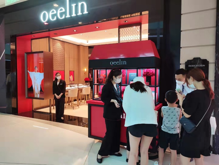在QEELIN店前也出現(xiàn)以紅黑撞色為主色調(diào)的互動(dòng)裝置,吸引不少消費(fèi)者前來參與打卡?!斑@個(gè)品牌的項(xiàng)鏈我很喜歡,這次來發(fā)現(xiàn)參與互動(dòng)打卡還可以領(lǐng)小禮品,可以選擇的東西還挺多,我最喜歡那個(gè)小巧的包包。”來自廣西的陳女士指著展示臺上的禮品說到。據(jù)了解,QEELIN此次活動(dòng)禮品選取了多款式飲品、IP小熊貼紙和帶有品牌logo的裝飾包包,顧客只需拍照打卡分享至社交平臺即可領(lǐng)取心儀禮品。