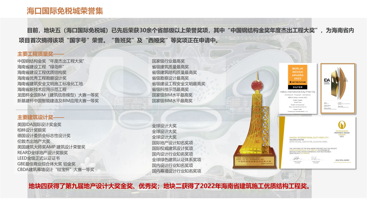 ▲ 海口國際免稅城項目整體建設(shè)所獲榮譽(yù)