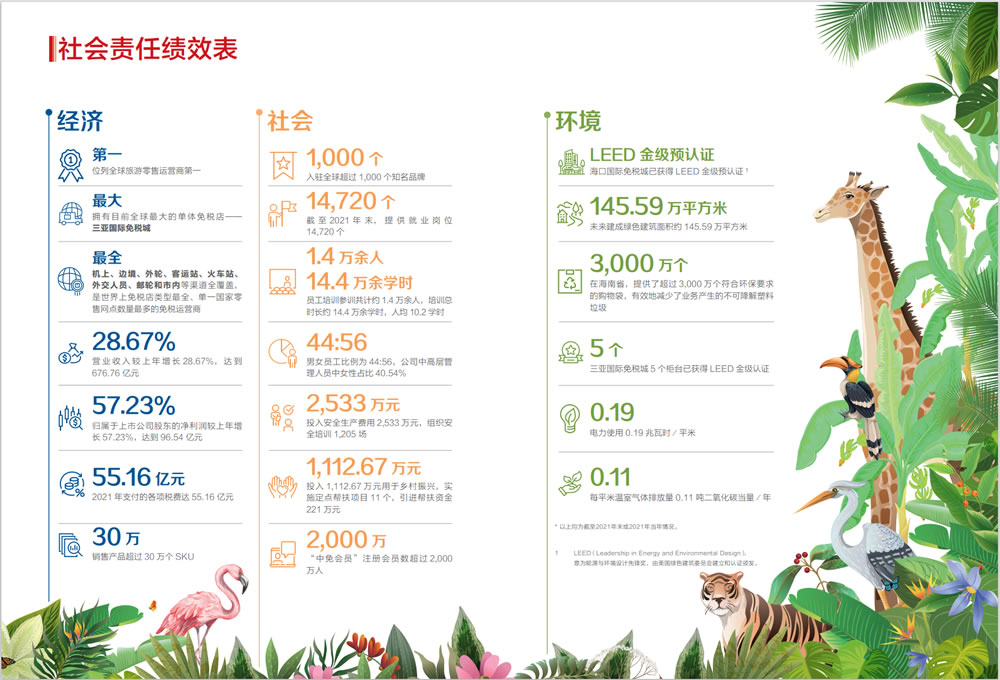 7月18日,中國旅游集團中免股份有限公司以中英文雙語的形式,披露了公司上市以來的首份ESG報告——《2021年度環(huán)境、社會及管治報告》。公司以不斷滿足消費者日益增長的對美好生活的追求為使命,在推動公司高質(zhì)量發(fā)展的同時,積極以行業(yè)道德行為和成果貢獻回饋社會,成績斐然。